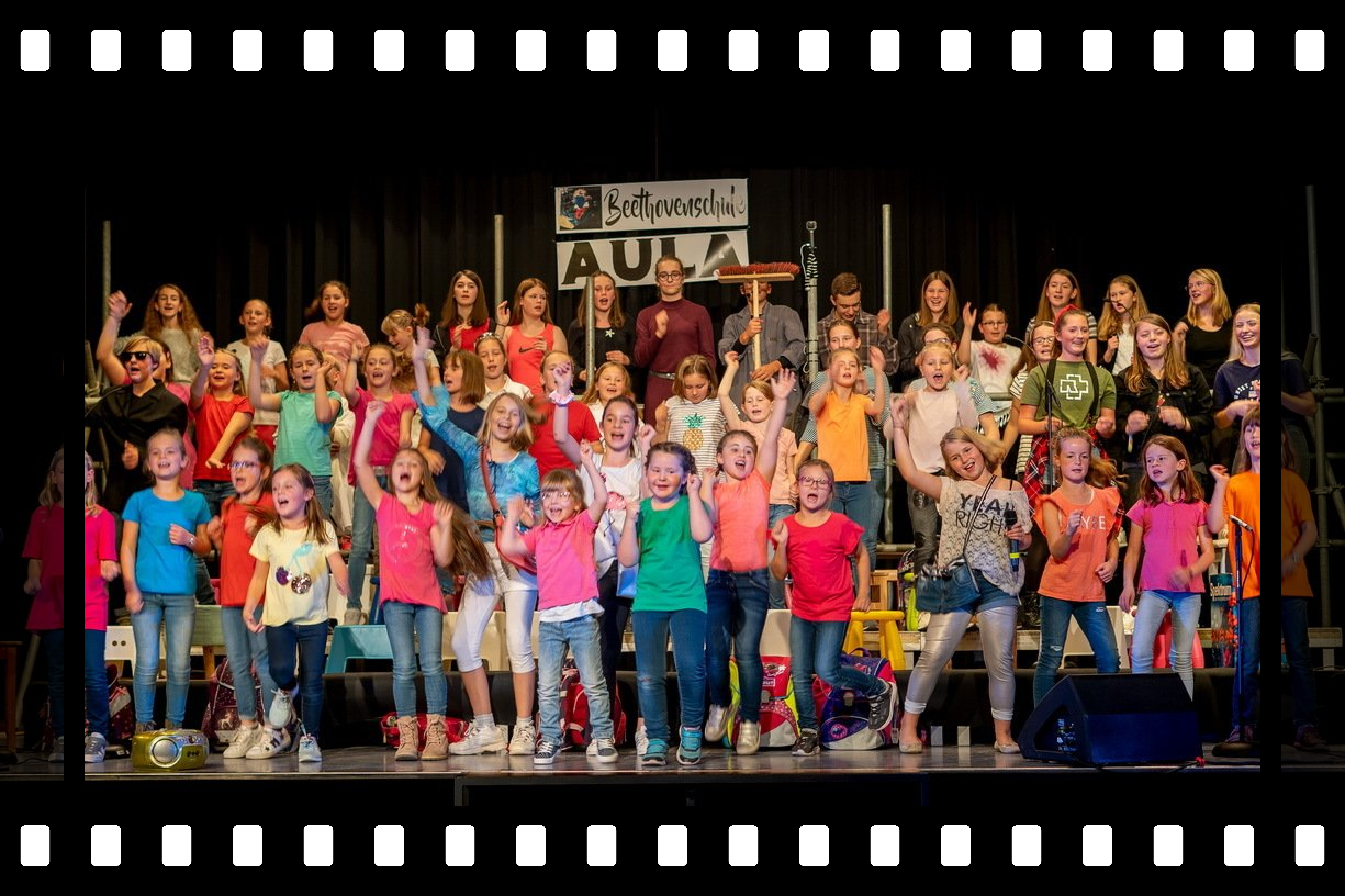 Nach der Begrüßung und einem fröhlichen Geburtstagsständchen für Antonia Klaes und Ida Novotny begann das Musiktheaterstück „Coco Superstar“ mit dem Hausmeister im grauen Kittel, gespielt von Louis Trapp. Allerdings blieb die Bühne leer, denn Hausmeister Trapp fegte im Publikum unter den Stühlen, staubt hier und da mal ab und sorgte damit für erste Lacher.Die Bühne der Bausenberghalle zeigte die Aula der Beethovenschule, wo sich alle Schüler um 8.00 Uhr trafen, um den Manager des Superstars Coco zu treffen. Dort sangen die drei absoluten Coco-Fans Hannah Adam, Žana Pütz und Lilli Vater ein Loblied auf ihren Superstar und zankten sich mit den genervten Rock-Fans, gespielt von Marcella Müller, Laura Kempkens und Lilly Heinrich.
