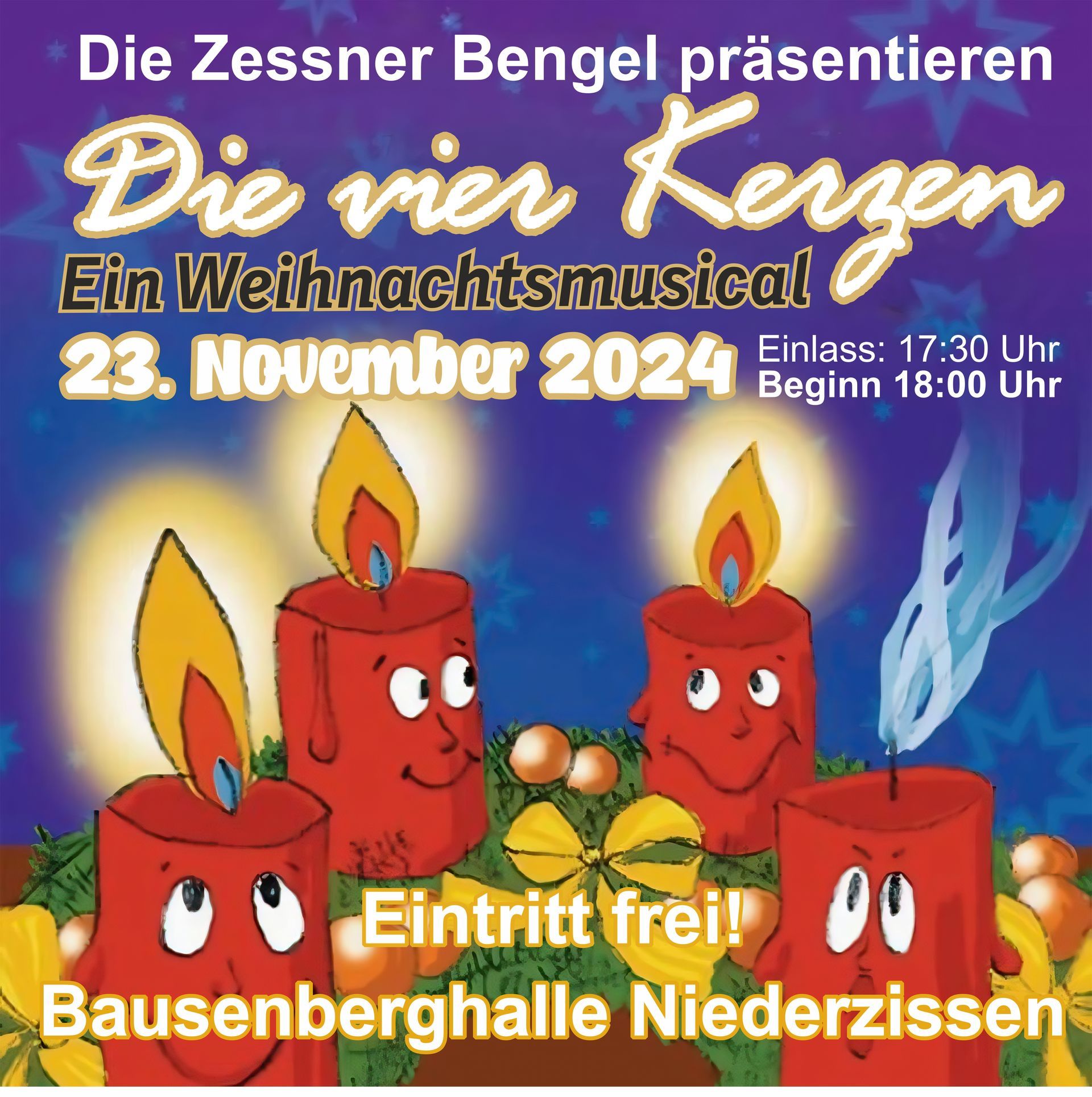 Die Adventszeit beginnt und das Weihnachtsfest steht vor der Tür. Eine spannende Zeit, nicht nur für Kinder. Die vier Kerzen des Adventskranzes sind ganz aufgeregt. Endlich ist ihr großer Auftritt gekommen. #kinderchor #weihnachtslieder #weihnachtsvorfreude #besinnlichkeit #advent #4kerzen #Frieden #Hoffnung #Glaube #Liebe Die Zessner Bengel freuen sich über zahlreiche Besucher. Der Eintritt ist frei. Ein Weihnachtsmusical für groß und klein rechtzeitig zur Einstimmung auf den ersten Advent.